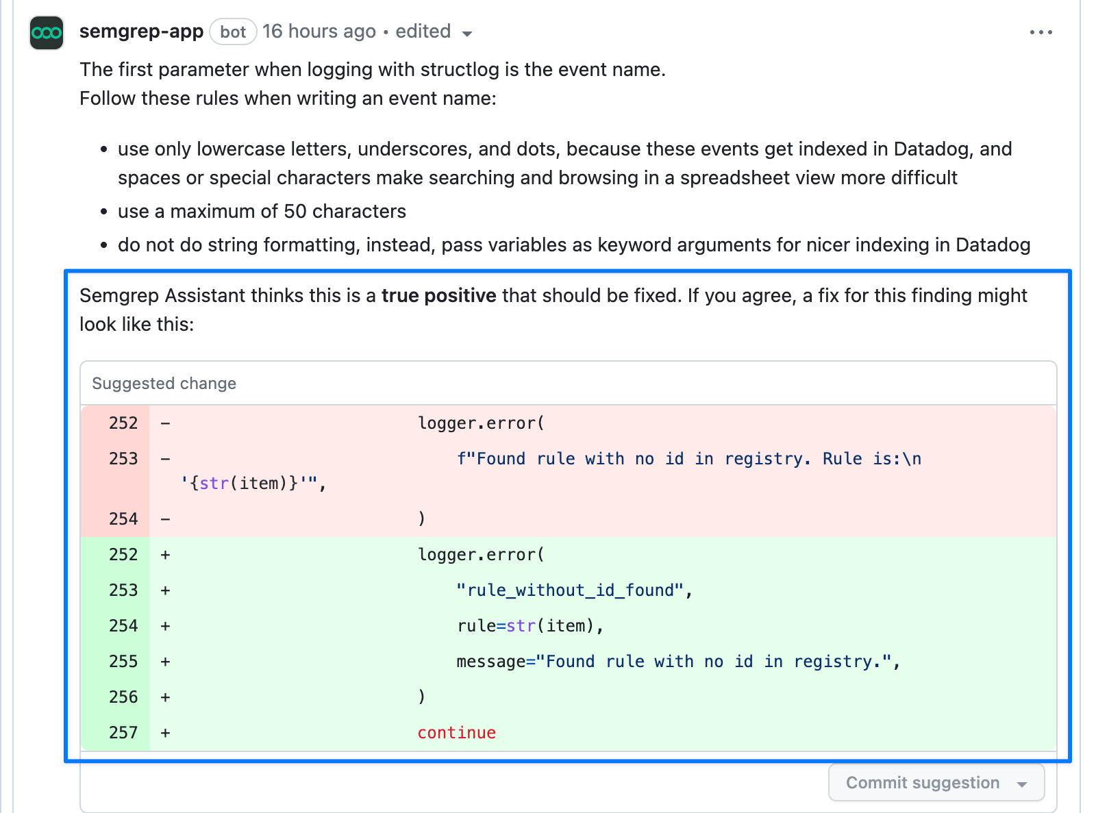 Our existing users will recognize that we already have a similar autofix feature built into Semgrep as part of our rule syntax. And indeed, we don't see AI suggestions replacing hand-written precise and deterministic codemods anytime soon. It seems on the other hand that AI is capable of autofixing an entirely different set of issues well. See the below illustration of when AI knowledge comes in handy.